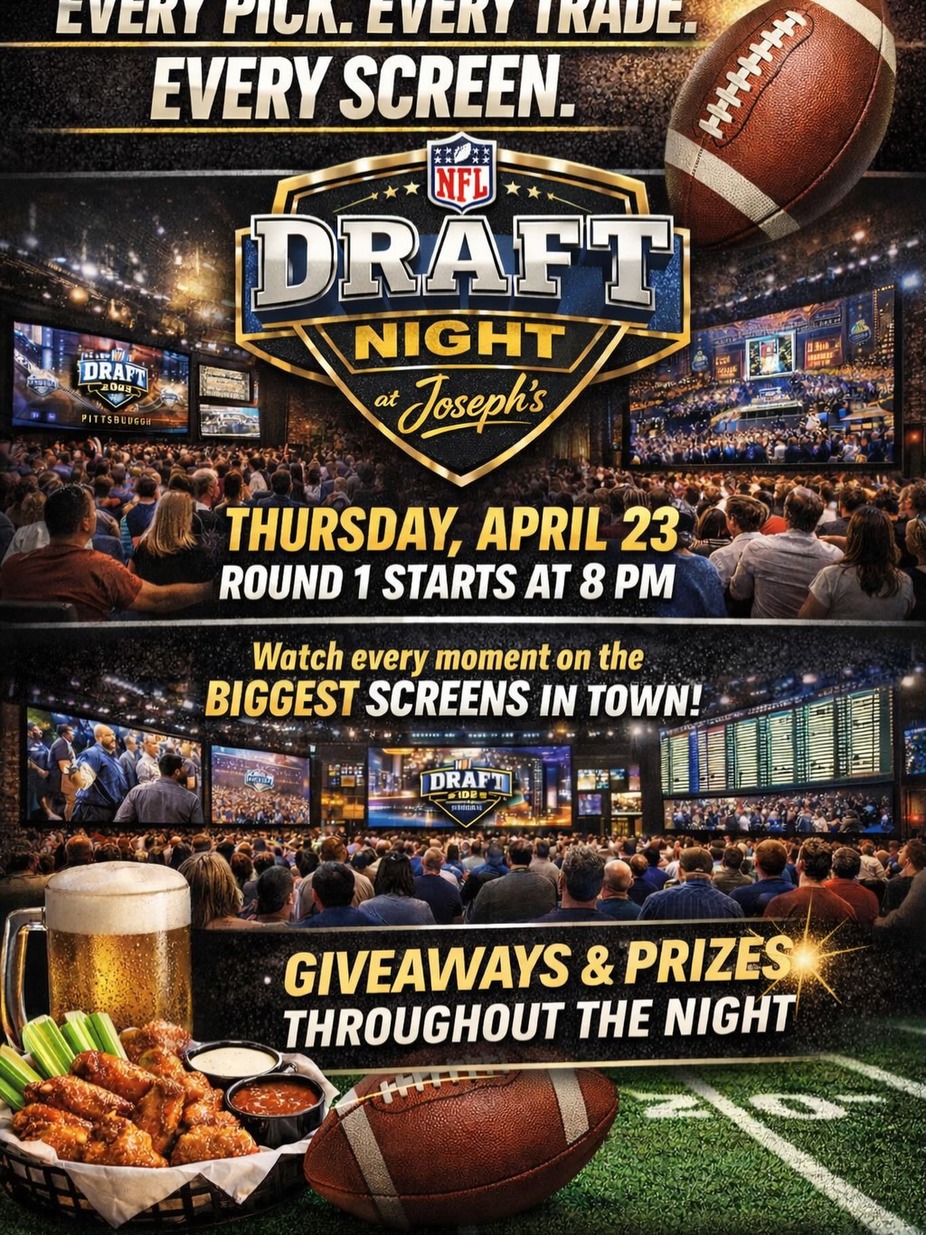Draft Night at Joseph’s is where every pick, every trade, and every big moment comes to life. Join us Thursday, April 23 at 8 PM for the first round on the biggest screens in town. Bring your draft crew, grab wings and drinks, and catch every moment live with giveaways and prizes happening throughout the night. Whether you’re watching for your team’s next star or just here for the energy, this is the place to be for Draft Night.
