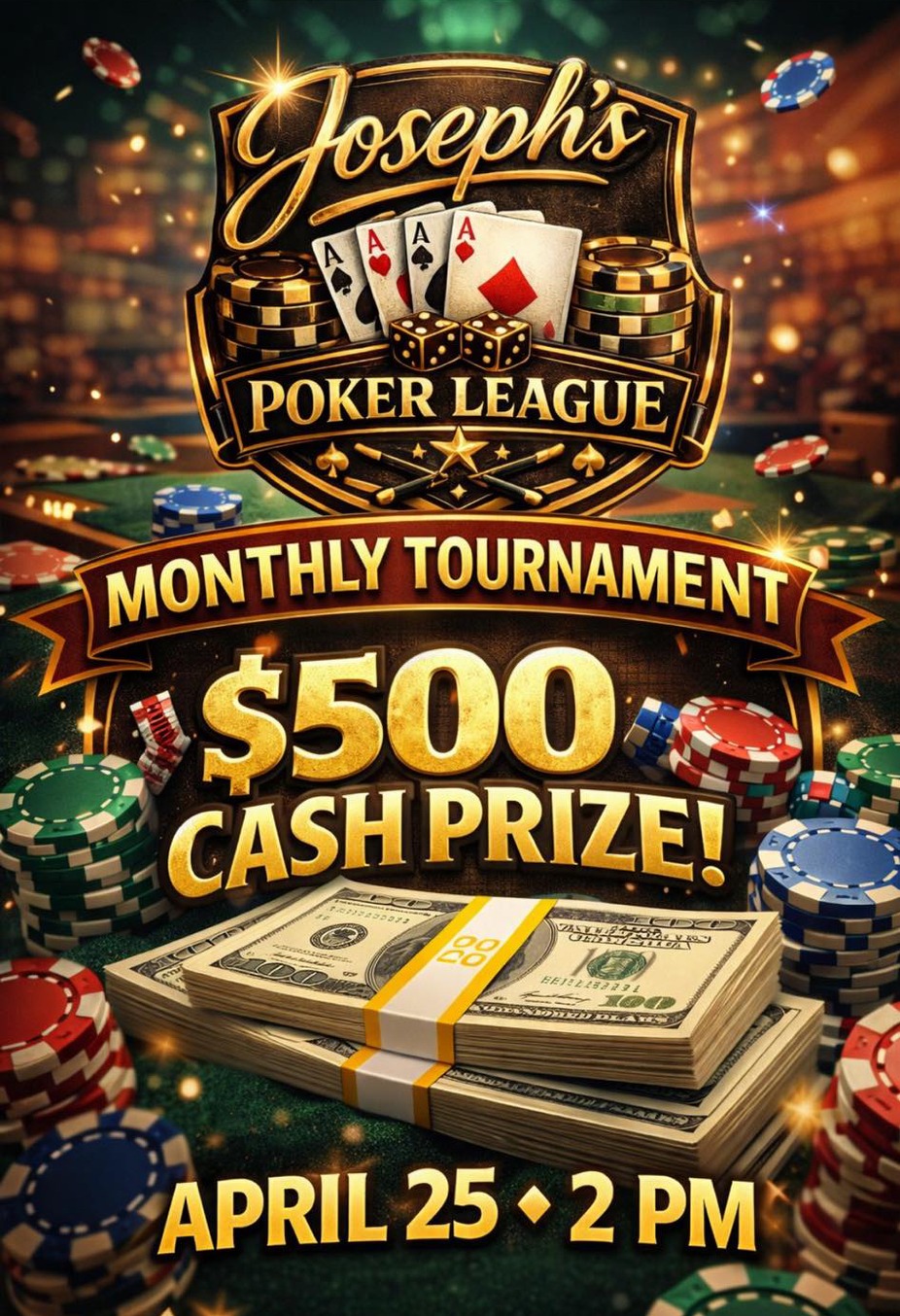 Bring your GAME for your shot at the $500 Prize as Joseph's hosts it's 1st Monthly Texas Hold'em Tournament!!!