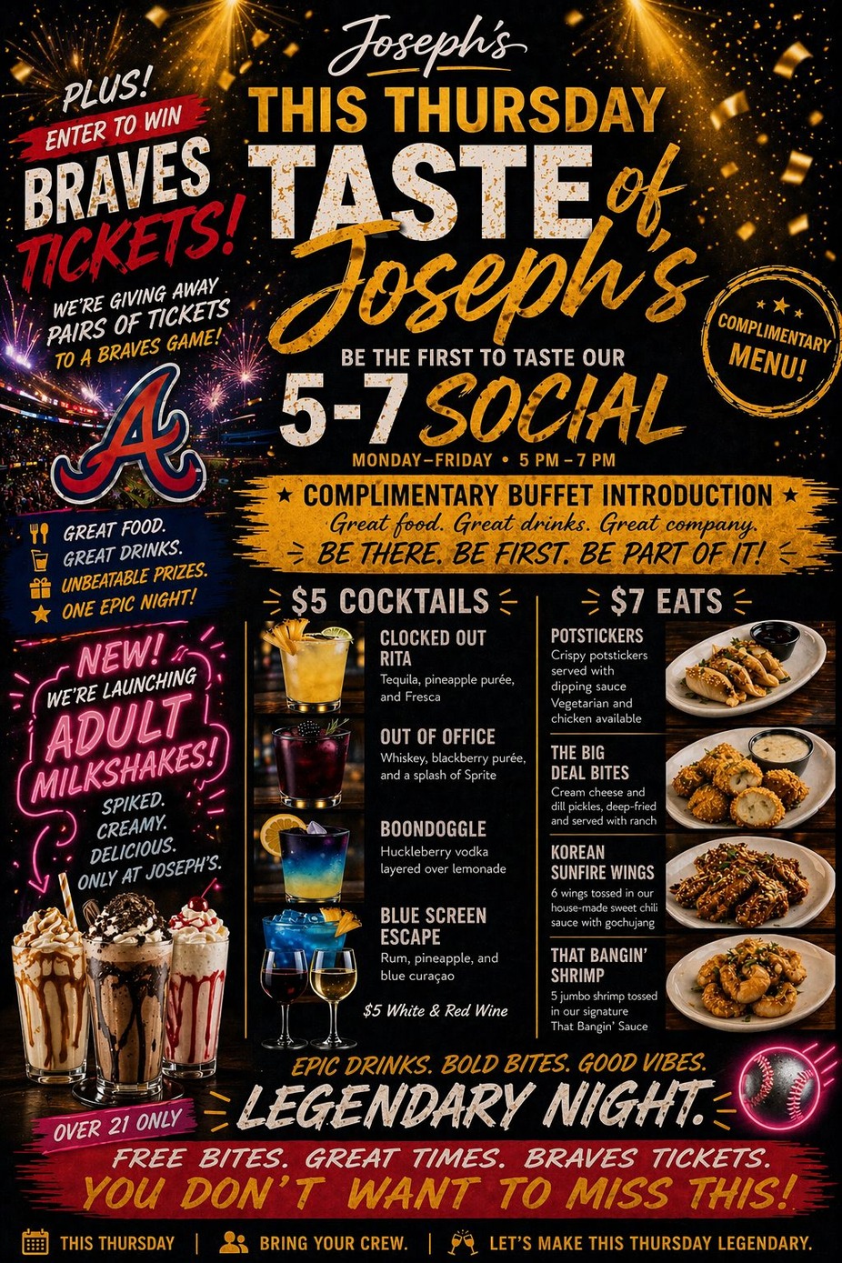You DO NOT want to miss the 5 to 7 Social Introduction Party at Joseph's on Thursday at... you guessed it... 5pm! Our way of introducing you to Joseph's New 5 to 7 Social every Monday thru Friday! Complimentary Menu Sampling, Fantastic New Drinks and Adult Milkshakes plus a chance to WIN a pair of Braves Tickets! Come ready to Mingle and have a Great Time!!!